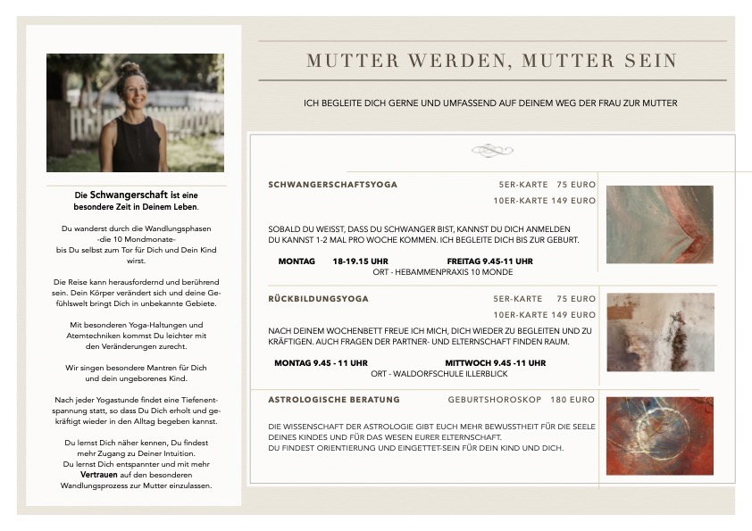 So empfehle ich Dir, so früh wie möglich mit der Schwangerschaftsbegleitung zu beginnen. Ich begleite Dich, angelehnt an die chinesische Medizin, durch die Wandlungsphasen der Schwangerschaft, den Vorzimmer, die 5 Wandlungsphasen und den Nachhimmel. Wissensvermittlung, Raum für Austausch und eine abgestimmte Yogakryia mit Meditation und Entspannung bilden eine Einheit.