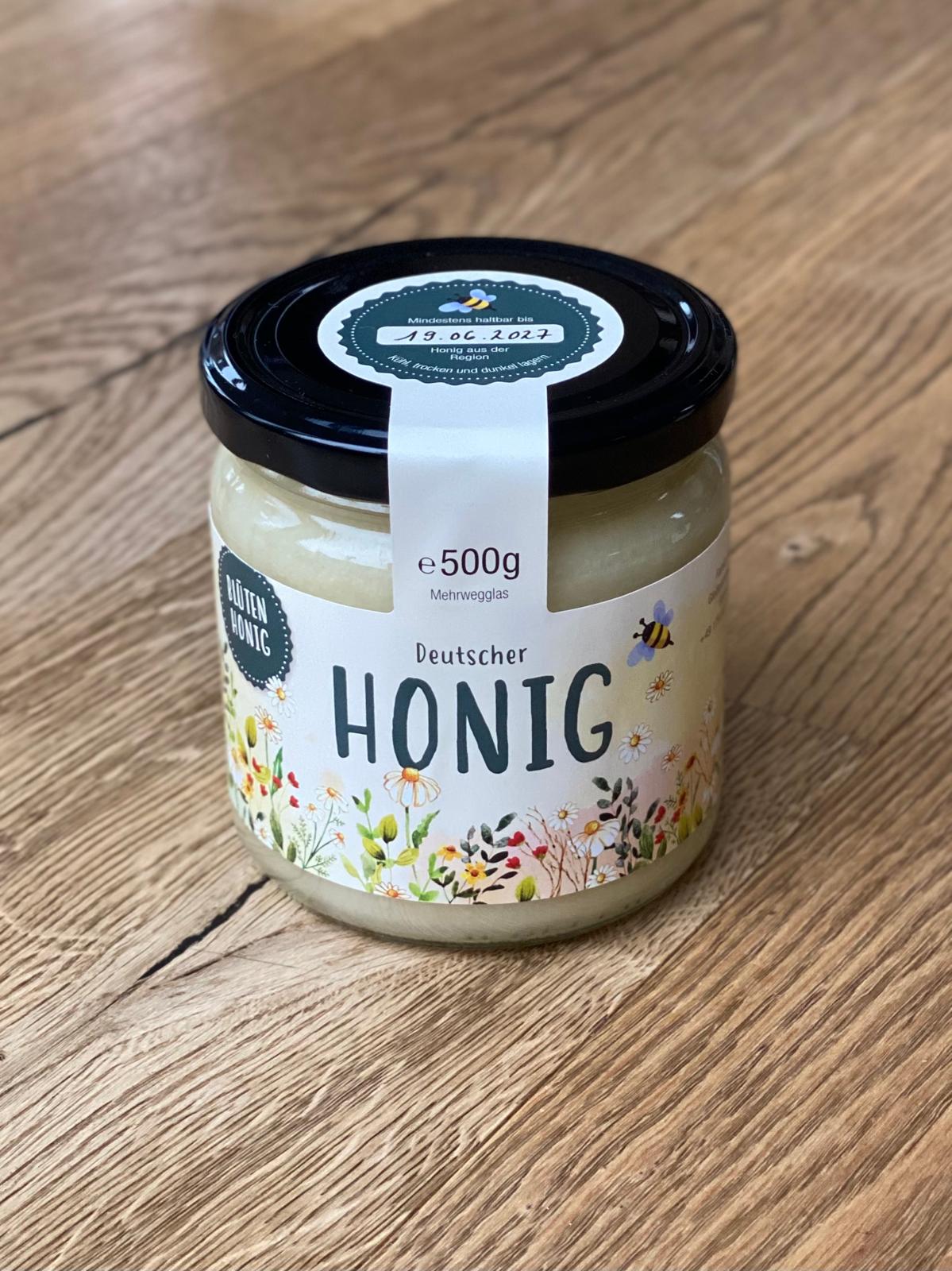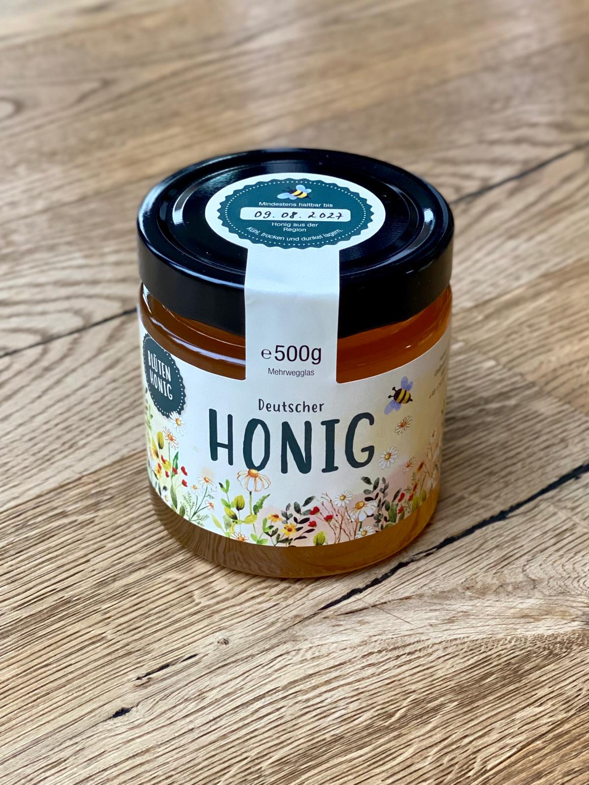 Unsere Bienen sammeln ihren Nektar im Rhythmus der Jahreszeiten. Daraus entstehen – je nach Verfügbarkeit – Frühlings- oder Sommerhonig, abgefüllt in 500g-Gläser.